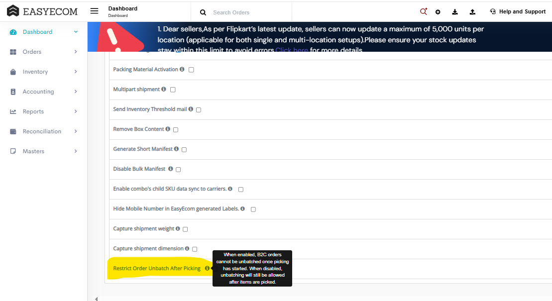 Path: Account Settings → Other Settings → Restrict Order Unbatch After Picking