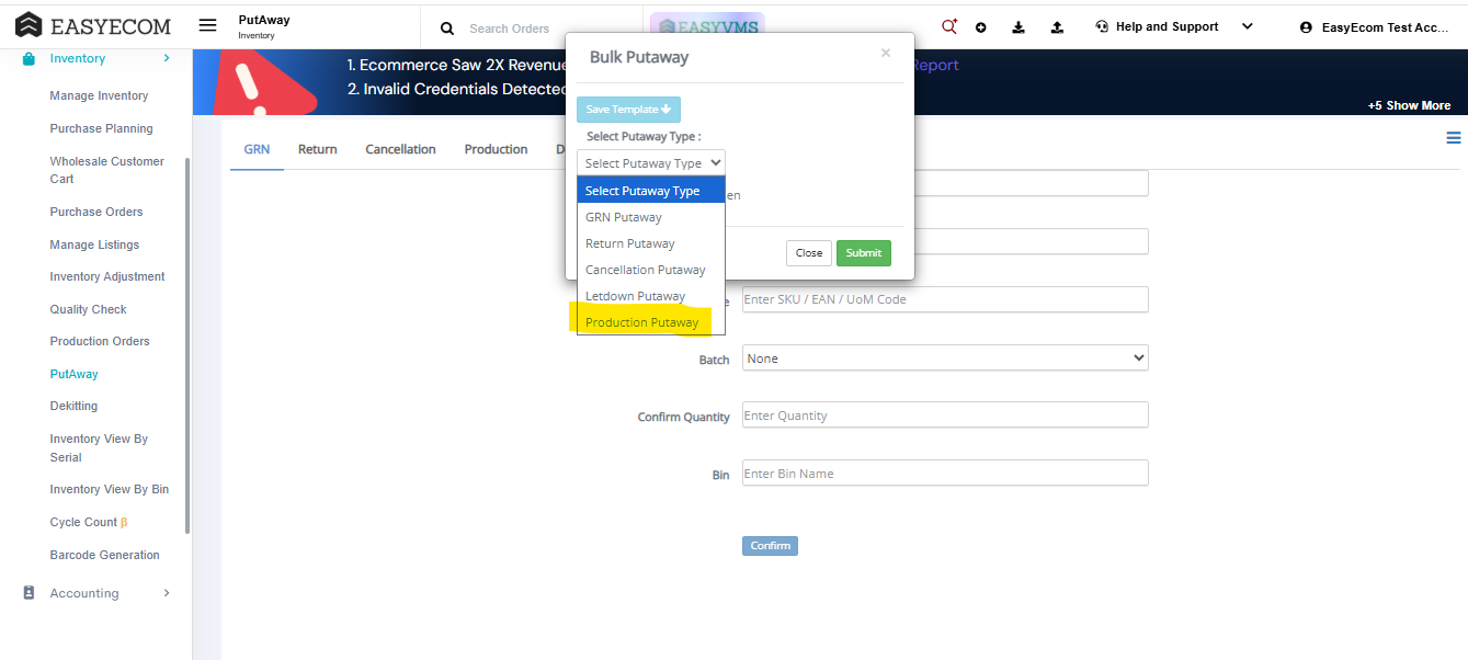 Path: Toggle Menu → Inventory → Putaway → Hamburger Menu → Bulk Putaway → Select Putaway Type