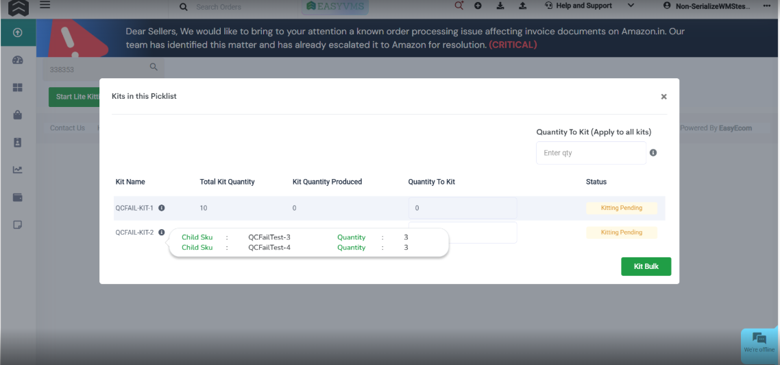A new bulk quantity input field has been added at the top of the Kitting Station. Adding a value populates the same quantity for all kit rows in the list.